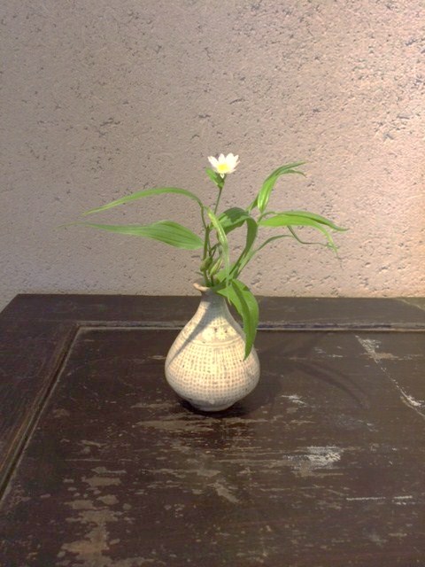 茶箱に入れて振出でも使えそうですが小さな野花が似合います。小さくても花と暦がびっしり丁寧に象嵌されています。