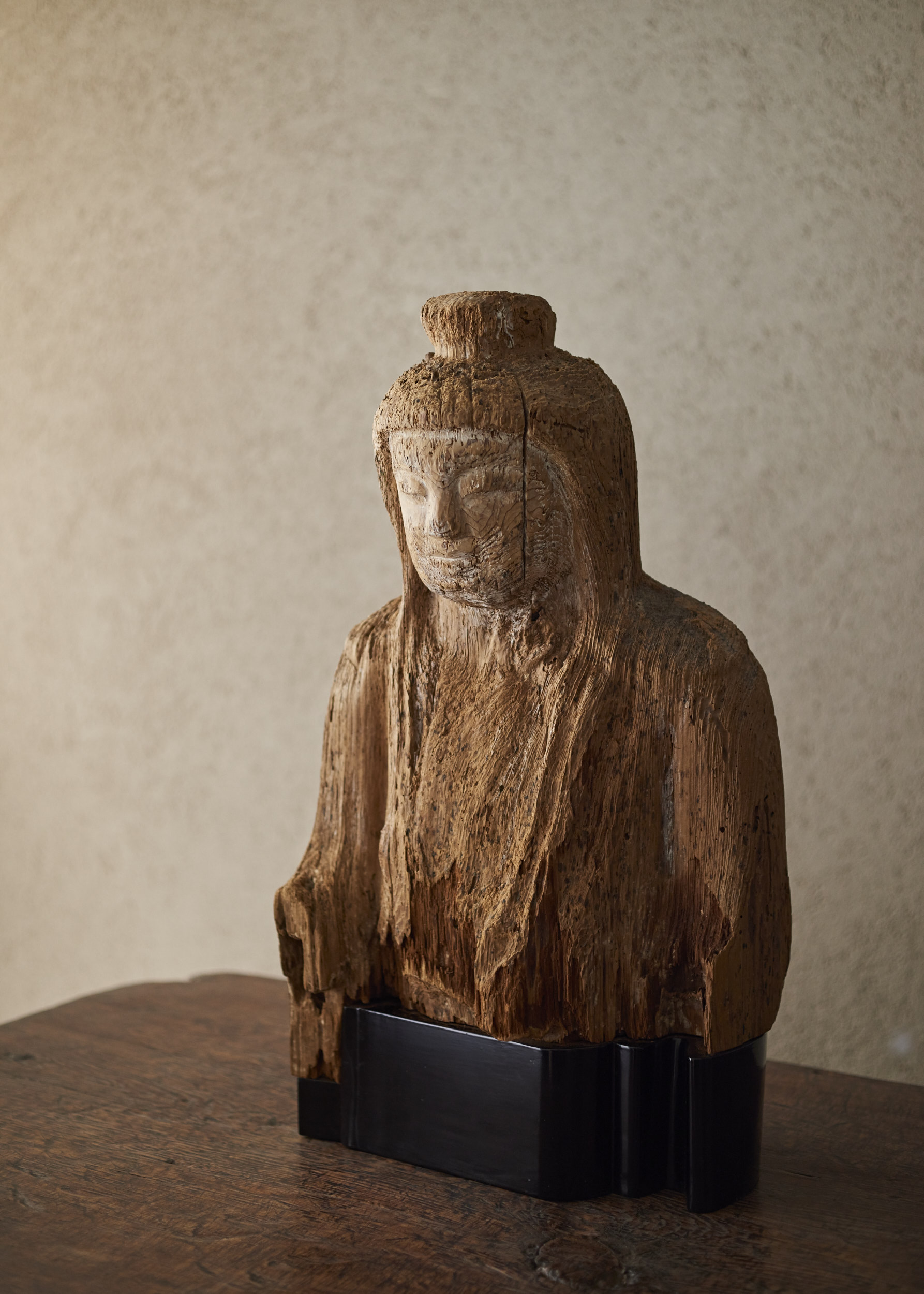 具現化しすぎないという特性上、素朴な作りのものも多い神像は、時代特定も難しいのですが、本作は丸みを帯びながらも引き締まった表情などからみても、平安時代後期頃のものではないかと考えられます。