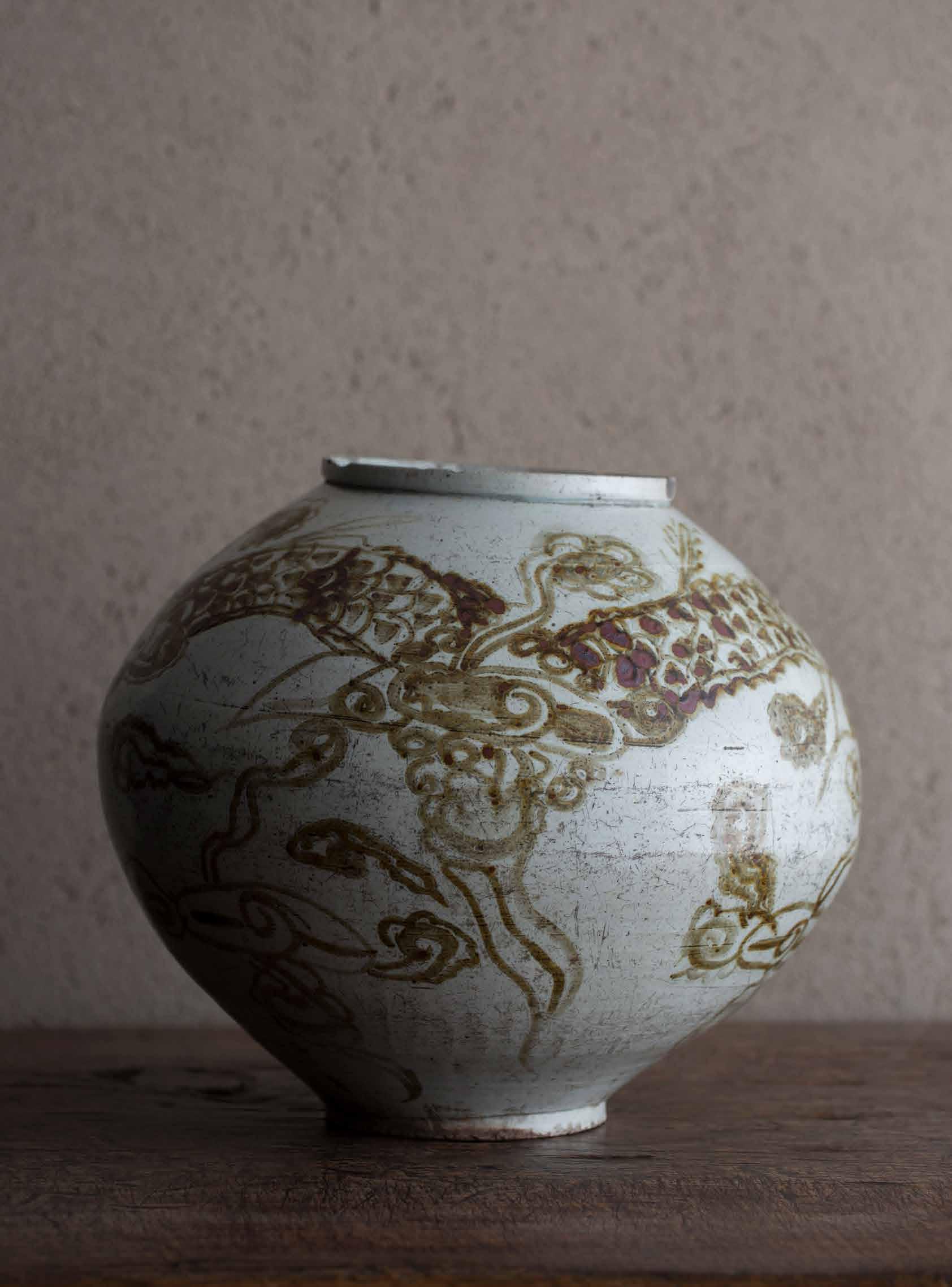 雲龍文は鉄砂の代表的な文様の一つだが、その描かれ方にはいくつかのパターンがあるようだ。例えばこの壺では、正面向きの龍頭と雲間に隠れた胴体がひとつなぎとなり、唐草文風に抽象化されている。宮中で用いられた青花白磁雲龍文の厳かさに対して、なんと自由なのだろう。表面に触れてみると、絵付け部分の胎土には凹凸があり、そこに溜まった鉄釉とそうでないところに濃淡が生じ、平板な印象を免れている。決まった型から逸脱して、時に我々を驚かせる李朝らしい珍品ではないだろうか。